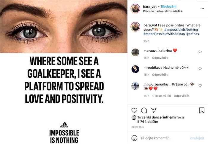Sportovní značka Adidas spouští globální kampaň „Impossible is Nothing“ (Nic není nemožné), s níž chce demonstrovat svůj dlouhodobý postoj ke sportovní kultuře i ke světu, který je plný příležitostí. Mezinárodní část uvede sérií dvaceti spotů se světovými ambasadory, na sociálních sítích se do kampaně zapojí čeští sportovci Tomáš Satoranský a Barbora Votíková či youtuber Karel „Kovy“ Kovář.