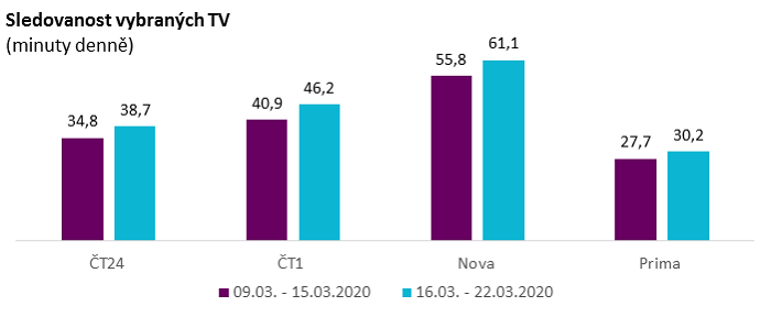 Všem hlavním televizním stanicím se zvyšuje sledovanost, především sledovanost doma, ale i přes karanténu posiluje také sledovanost televize i mimo domov. Rovněž posiluje návštěvnost televizních webů.