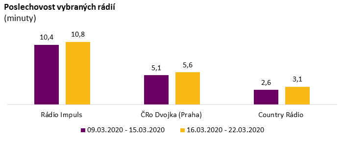 Za poslední týden naměřila výzkumná společnost Median v projektu adMeter další změny v mediální konzumaci způsobené epidemií koronaviru. V týdnu od 16.3. do 22.3. 2020 Češi věnovali v průměru ve všední den 9 hodin a 20 minut svého času sledování televize, poslechu rádia, návštěvě internetu a mobilních aplikací dohromady, o víkendu pak téměř 10 hodin.