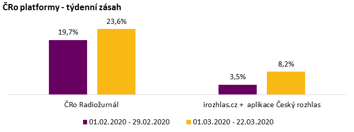 Nárůst v týdenním zásahu je viditelný u ČRo Radiožurnálu, ale také webu irozhlas.cz a aplikace Českého rozhlasu v porovnání března s únorem.