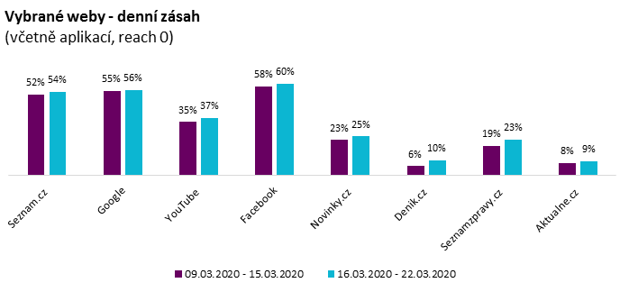 V případě internetu v porovnání s předchozím týdnem navýšily mírně svůj denní zásah v týdnu 16.3. - 22.3. nejen hlavní online platformy Google, YouTube, Facebook i Seznam, ale také většina zpravodajských webů (např. novinky.cz, seznamzpravy.cz, denik.cz, či aktualne.cz). U většiny těchto zpravodajských platforem roste nejen zásah, ale i čas strávený čtením či sledováním zpráv.