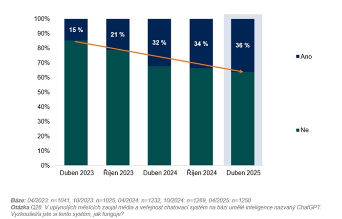 Podle výzkumu Ipsos pro Univerzitu Karlovu vyzkoušela systém umělé inteligence ChatGPT více než třetina Čechů. Popularita této chatovací platformy v Česku neustále roste. Tři z deseti lidí, kteří ChatGPT vyzkoušeli, jej používají alespoň několikrát týdně.