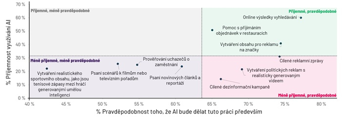 Online vyhledávání výsledků pomocí AI považují lidé za nejvíce pravděpodobné a nejvíce příjemné. Naopak to, že by AI vytvářela politické reklamy a cílené dezinformační správy považují lidé za nejméně příjemné a vysoko pravděpodobné.