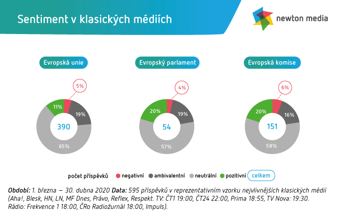 Pozitivní sentiment se začal formovat s tím, jak se aktivizovaly Evropská komise a Evropský parlament. Byl spjat s mohutnou hospodářskou pomocí, která byla přislíbena členským státům, ale i se společnými repatriačními lety občanů EU, společnou distribucí zdravotnického materiálu a konečně i s vývojem vakcíny proti viru. Ze sociálních médií vyváženým sentimentem vymykal Twitter.