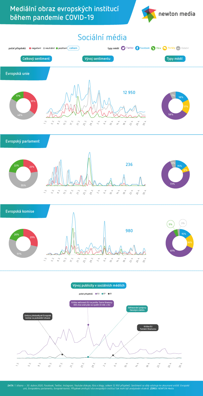 V sociálních médiích byl sentiment evropských institucí o třídu horší, zejména s ohledem na negativní tón. Jestliže na Twitteru byla ještě situace v rovnováze, na Facebooku atakovala kategorická kritika 40% hranici a v případě diskusí pod články se dokonce blížila 60 %. Evropa v očích svých kritiků řešila místo „skutečného problému“ vesměs zástupné věci jako třeba klimatickou agendu (Green Deal, klimatické cíle), a tváří v tvář pandemii se ozřejmila její nepotřebnost. Byla to především tato myšlenková šablona, která stála za většinou reputačních škod.