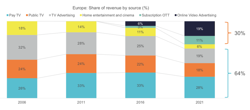 Zkušenosti z amerického trhu ukazují, že v dlouhodobém pohledu se příjmy z placené TV a z lineární TV reklamy snižují (přestože rok 2021 je z pohledu vývoje TV reklamy výjimečný a oproti rokům 2020 i 2019 jsou příjmy vyšší). V Evropě je zatím situace jiná: zde se příjmy z placené TV v posledních deseti letech zvyšují a do roku 2019 rostly i příjmy z TV reklamy. Ty zbrzdila v loňském roce pandemie covid-19, letos se ale vrátily na růstovou trajektorii.