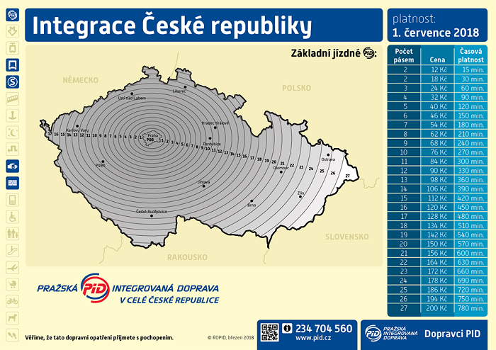 Pražská integrovaná doprava (PID) informovala na svých facebookových stránkách o novince, která byla v tomto týdnu definitivně schválena vládou v demisi. Na základě dlouhodobých jednání s jednotlivými krajskými úřady, obcemi, dopravci a koordinátory, byla k termínu 1. července 2018 dohodnuta integrace celé České republiky do systému PID, pracovně nazývaná jako tzv. „Královská integrace“. Na jednu jízdenku mají lidé dojet odkudkoli kamkoli, s jakýmkoli dopravcem. Cestujícím se má výrazně usnadnit a zlevnit pohyb po vlasti. Každá oblast bude spadat do určitého tarifního pásma - prstenců kolem Prahy, kterých bude celkem 27.