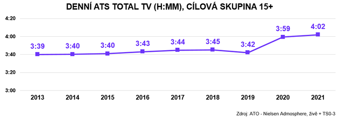 V loňském roce byla sledovanost televize rekordní – dosáhla 4 hodin a 2 minut, což je o více než 20 minut více než před deseti lety. Přispěla k tomu také covidová pandemie, díky které trávili Češi v letech 2020 a 2021 před obrazovkami více času.„Svoji nezanedbatelnou roli sehrála i kvalitní a pestrá programová nabídka. Odsledovaná doba potvrzuje fakt, že televize je u nás stále velmi silným médiem,“ dodala Vlasta Roškotová, jednatelka ATO.