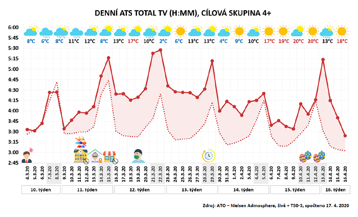 Graf níže ukazuje srovnání TV sledovanosti den po dni od začátku března s průměrnými hodnotami této sledovanosti za poslední tři roky (stejný den v týdnu, stejné číslo týdne, průměr let 2017–2019). Z dat je patrné, že až do 9. března byla sledovanost na úrovni předchozích let. Po uzavření škol od 11. března došlo k nárůstu sledovanosti o téměř 30 minut denně. Další skokový nárůst nastal od pondělí 16. března po zavedení omezení volného pohybu osob. Vysoká sledovanost vydržela dva týdny (12. a 13. týden). Mezi 13. a 14. týdnem nastal pokles, podobně jako v jiných evropských zemích. Na výsledcích se také projevil efekt počasí, pěkné počasí od 5. do 12. dubna například přispělo ke snížení sledovanosti až na pouhých 20 minut nad průměr posledních tří let.