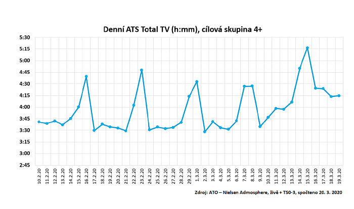 Od úterý 10. března, kdy vláda s ohledem na pandemii koronaviru zakázala kulturní, sportovní a společenské akce s účastí nad 100 osob a vyhlásila uzavření škol od následujícího dne, lze v českých datech pozorovat prudký nárůst denní sledovanosti televize.
