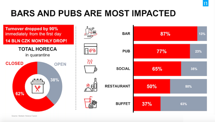 Naopak nejvíce postiženým prodejním kanálem je HORECA. Byť se některé provozy snaží být v omezené míře otevřeny (nejvíce bufety s výdejovým okénkem), jejich obrat poklesl o více než 90 %, což činí podle propočtů Nielsenu ztrátu ve výši 14 miliard korun měsíčně. Prodej tvrdého alkoholu poklesl o 99 %, piva a nealkoholických nápojů o 97 % a vína o 93 %. Jediné, na čem se nyní snaží restaurace a hospody vydělávat, je jídlo, jehož prodej poklesl „jen“ o 90 %.