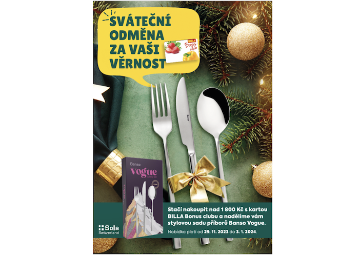 Při nákupu nad 1800 korun a při předložení věrnostní kartičky získají zákazníci sadu příborů švýcarské značky Banso Vogue. „Tato sada ocelových vidliček, nožů a lžic vydrží díky svému kvalitnímu zpracování opravdu dlouho. Svým stylovým designem se hodí do každé domácnosti, a tak může být hezkým dárkem pod stromeček třeba pro někoho blízkého,“ dodává Dana Bratánková z řetězce Billa. Příborový set bude k dostání v období od 29. listopadu až do 3. ledna 2024.