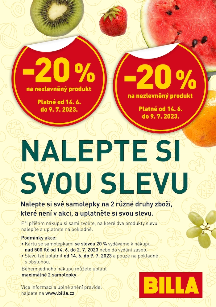 Obchodní řetězec Billa startuje letní slevovou akci. Zákazníkům nabídne slevu až 20 %, kterou mohou uplatnit na dva produkty jakéhokoliv nezlevněného zboží formou speciálních nálepek. Stačí jen nakoupit za více než 500 korun. Akce potrvá do 2. července.