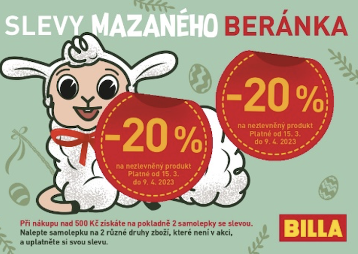 Obchodní řetězec Billa připravila přes velikonočními svátky dvě slevové akce. Na další zlevněné zboží upozorní zákazníky na prodejnách speciální komunikace s beránkem, kterému se „slevy lepí na paty“.