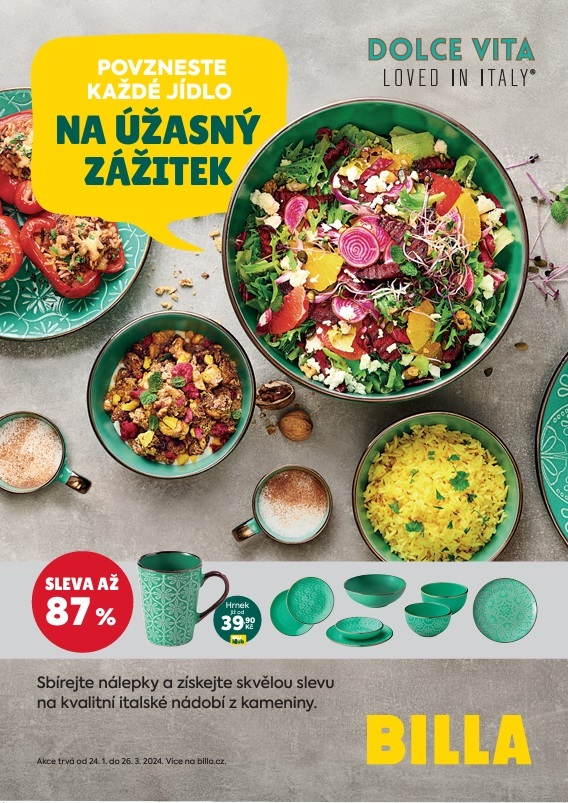 Obchodní řetězec Billa odstartovala 24. ledna svou první letošní věrnostní akci, v níž nabídne kameninové nádobí Dolce Vita. Za nasbírané samolepky si budou zákazníci moci zakoupit nádobí se slevou, členové Billa Klubu navíc na dané výrobky obdrží věrnostní slevu navíc. Kampaň bude končit těsně před velikonočními svátky 19. března.