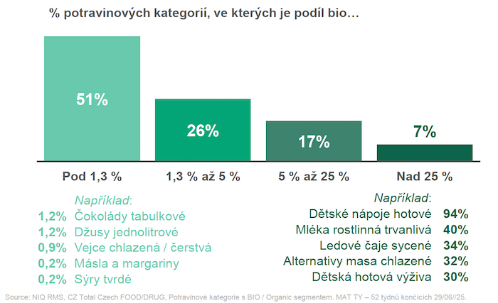 Nejčastěji se bio nakupuje v kategoriích dětské výživy, alternativ masa a mléčných výrobků (dětská hotová výživa – 30 %, rostlinná trvanlivá mléka 40 % nebo alternativy masa chlazené 32 %). Naopak v polovině kategorií je podíl bio pod průměrem – je tomu tak například u másla a margaríny (0,2 %), tvrdé sýry (0,2 %). Existuje tak ještě dostatek prostoru pro další růst.