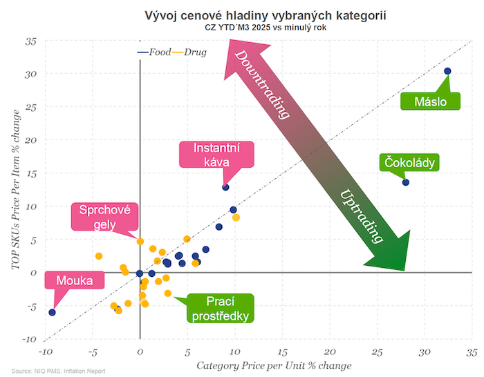 Růst cenové hladiny však neodráží pouze inflaci, resp. zdražování produktů. Čeští spotřebitelé se postupně vracejí také k prémiovějším produktům. To dokládá fakt, že v 90% potravinových a 65% drogistických kategorií růst celkové cenové úrovně v rámci dané kategorie převyšuje růst ceny za položku/kus u nejprodávanějších výrobků dané kategorie. Takový scénář lze pozorovat například u čokolád nebo pracích prostředků.