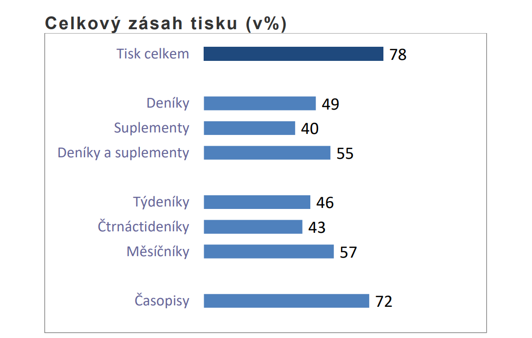 Celkový zásah tištěných médií dosahuje 78 % populace ve věku 12-79 let. Deníky a jejich přílohy oslovily celkem více než 55 % populace. Čtenářem alespoň jednoho časopisu vydávaného v ČR je více než 72 % populace, tj. absolutně 6,4 mil. osob. Ukazují to nová data výzkumu čtenosti Media projekt, která byla ve čtvrtek zveřejněna.