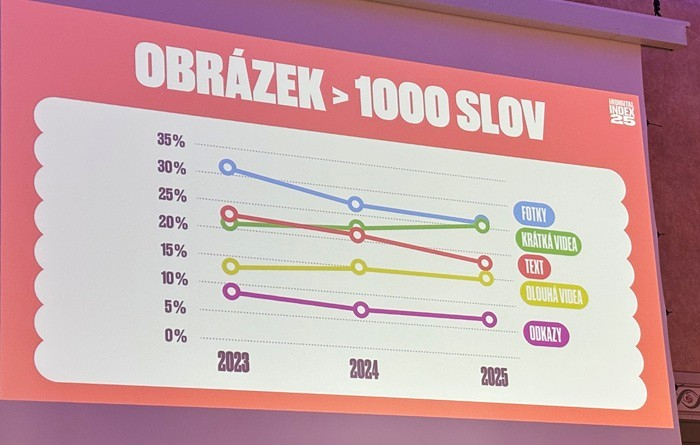 Jedním z klíčových trendů je další přesun k videoobsahu. „Krátká videa letos dohání fotografie a stávají se hlavním formátem obsahu na sociálních sítích," komentoval Vladan Crha. U mileniálů například vzrostlo využití Facebook Reels z 44 % v minulém roce na 61 % v tom letošním a u Instagram Reels nastal nárůst o celých 15 procentních bodů na 50 %.