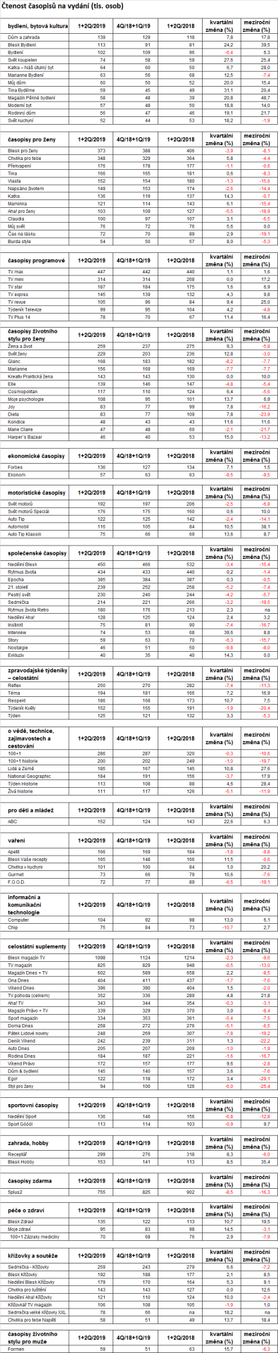 Čtenářem alespoň jednoho časopisu je podle nových výsledků výzkumu čtenosti Media projektu za první pololetí 2019 více než 72 % populace ve věku 12-79 let. Absolutně to představuje 7 mil. osob. Je to asi o 300 tisíc čtenářů méně než ve stejném období o rok dříve (-4 %). Výsledek je ale ovlivněn i tituly, které přestaly vycházet a ve výsledcích výzkumu se už neobjevují (např. Popcorn, Top dívky), čímž je celkový výsledek snížen. Aktuální výsledky navíc přinášejí i řadu magazínových titulů, u nichž výzkum registruje navýšení čtenosti.