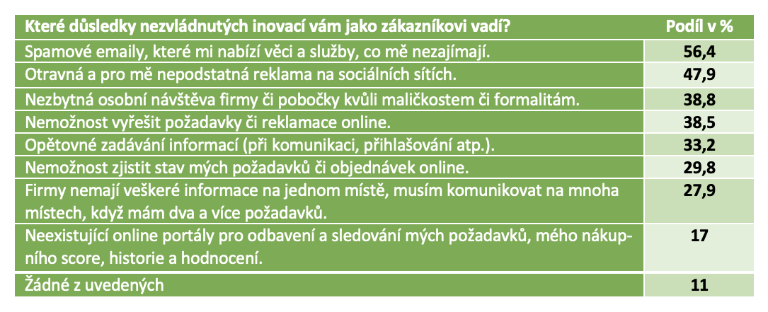 Češi jsou technologickým a digitálním inovacím nakloněni, ale zároveň nejsou slepí vůči chybám a nedostatkům. Pokud se tyto inovace nezvládnou nebo ignorují, 89 % zákazníků vadí negativní důsledky, které z toho vyplývají. Obzvlášť obtěžující jsou pro ně irelevantní komerční sdělení v e-mailu a na sociálních sítích. Více než třetině zákazníků vadí také zbytečné návštěvy poboček a nemožnost vyřídit některé úkony online. Vyplývá to z průzkumu, který na reprezentativním vzorku 1050 respondentů realizovala technologická společnost Enehano.