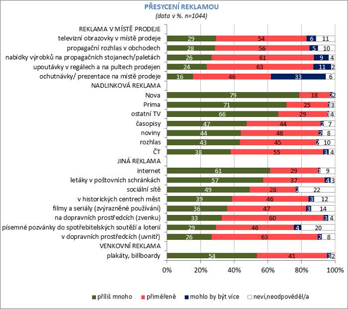 Nejvíce jsou lidé přesyceni reklamou v komerčních televizích, kde vadí hlavně přerušování pořadů reklamními bloky, které navíc mnohdy běží na více TV stanicích současně. Následuje reklama na internetu, letáky v poštovních schránkách a billboardy, které zaznamenaly největší nárůst přesycenosti od minulého roku (ze 48 % na 54 %). Strmě vzrůstá přesycenost reklamou na sociálních sítích. Nejčastěji se v tomto směru vyjadřují starší lidé s nižšími příjmy. Nejméně „vadí“ či naopak je žádána reklama na místě prodeje. Vyplývá to z nové vlny výzkumu Češi a reklama 2018 od České marketingové společnosti.