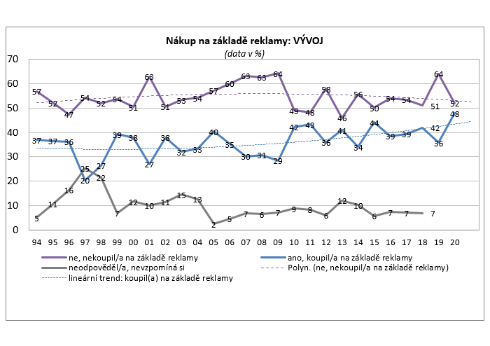 „Dlouhodobě platí, že lidí, kteří se zdráhají přiznat ovlivnění reklamou, je více než těch, kdo se k němu přiznávají. Zastoupení obou skupin od roku 2010 do loňského šetření oscilovalo na stejné hladině, v letošním roce se zvýšil podíl těch, kteří nákup na základě reklamy přiznávají na 48 %,“ podotýká autorka a zakladatelka výzkumu Jitka Vysekalová.