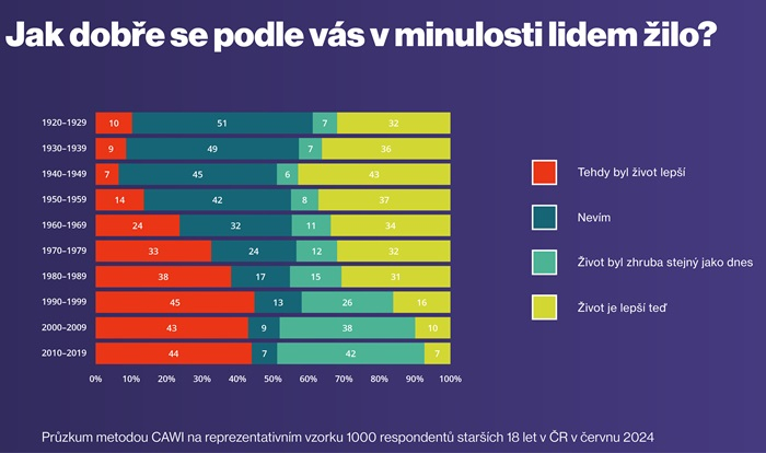 Češi jsou obecně nostalgičtí, když hodnotí kvalitu života v minulosti, konkrétně od 70. let do nedávna (2019). Zejména pro roky 1990 až 2019 převládá názor, že život byl tehdy lepší než dnes. I 70. a 80. léta hodnotí Češi spíš pozitivně, když třetina (70. léta) a 38 % (80. léta) si myslí, že tehdy byl život lepší než dnes. Na druhou stranu ale se změnou režimu na přelomu 80. a 90. let přibývá těch, kteří mají současnou dobu za lepší než minulost před rokem 1990 (cca třetina). Devadesátky (1990-1999) pak Češi nejvíce hodnotí jako období, kdy se žilo lépe než dnes (45 %).