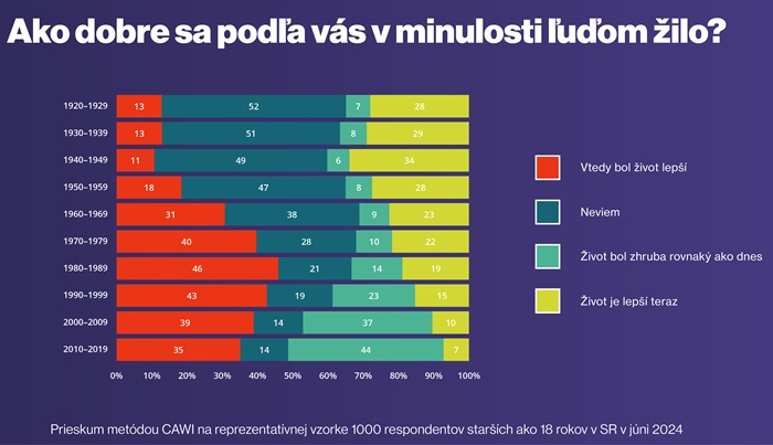 Na Slovensku je situace odlišná. Pád komunismu zde nepředstavuje tak výrazný zlom ve vnímání kvality života jako v Česku. Nostalgie po dobách minulých trvá o desetiletí dál do minulosti, až do 60. let. A konkrétně osmdesátá léta jsou dokonce dekádou, kdy nejvíce respondentů uvedlo, že se tehdy lidem žilo lépe než dnes. Pouze 19 % Slováků si myslí, že se nyní žije lépe než v 80. letech, zatímco v Česku je to 31 %. Na Slovensku jsou 80. léta na rozdíl od Česka totiž populárnější i mezi čtyřicátníky.