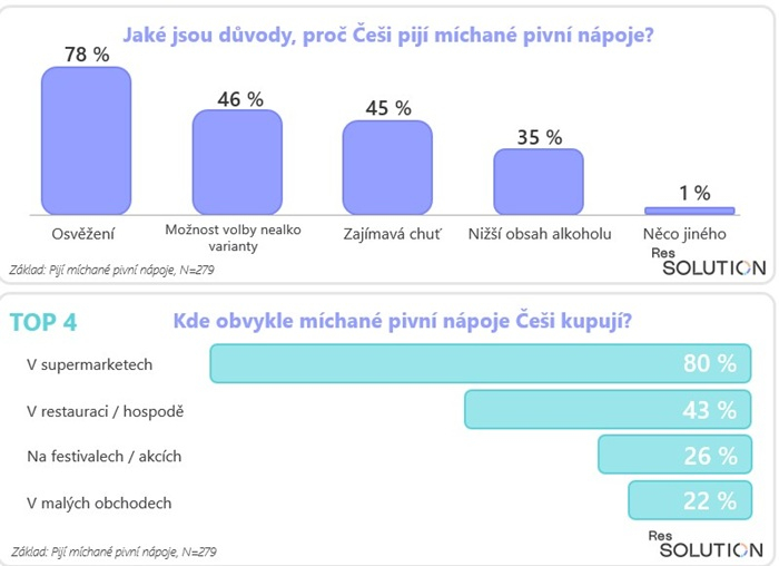 Míchané pivní nápoje Češi nejčastěji nakupují v supermarketech (80 %), méně pak v restauracích (43 %) a na festivalech (26 %). V malých obchodech je pořizuje 22 % respondentů. Přes domácí přípravu vede pohodlí nákupu: pouze 3 % si je připravují doma často a 11 % občas. Většina (67 %) to nikdy nedělá.