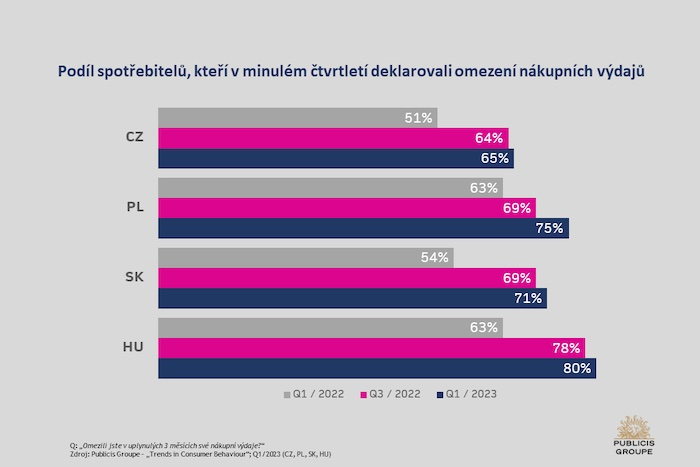 Počet lidí, kteří v uplynulém čtvrtletí omezili své výdaje, se oproti předchozímu období téměř nezměnil. Šetření napříč nákupními kategoriemi deklarovalo 65 %, což je skoro stejně jako ve druhém pololetí loňského roku (64 %). Míra omezování výdajů tak možná dosáhla svého vrcholu.