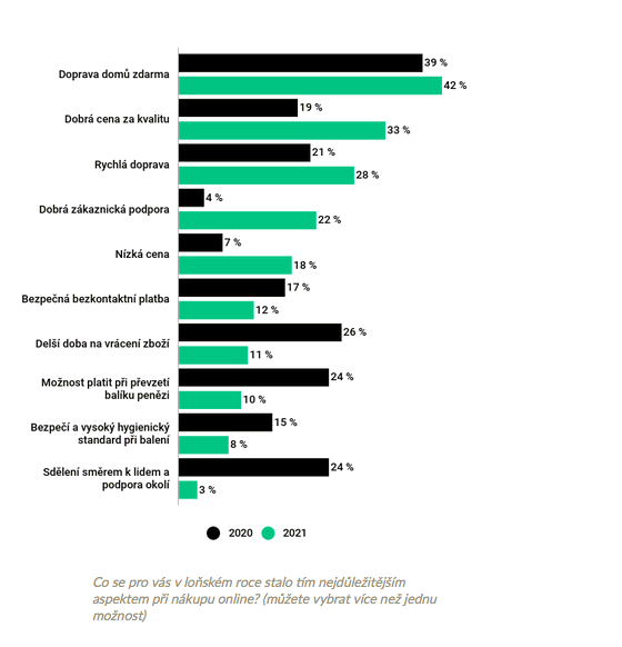 Prioritami při nákupu zůstaly rychlá doprava a doprava zdarma. Oproti loňskému roku výrazně narostla důležitost komunikace se zákaznickou linkou (22 %), dobrá cena za kvalitu (33 %) a celkově nižší cena (18 %).