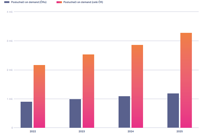 Český rozhlas předpokládá, že už v příštím roce dosáhne hranice milionu posluchačů, kteří budou poslouchat rádiové vysílání na vyžádání (on demand). Do roku 2025 by se jejich počet měl zvýšit na 1,2 milionu posluchačů. Odhaduje zároveň, že celý trh poslechovosti on demand by narostl z letošních 2,2 milionu na 3,2 milionu posluchačů v roce 2025. Vyplývá to ze Strategie Českého rozhlasu do roku 2027, kterou představil na čtvrtečním dopoledním semináři na půdě Senátu.