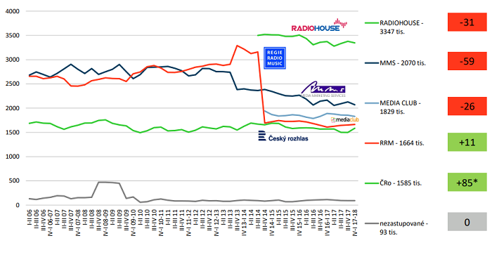 Díky vylepšené poslechovosti svých stanic zvýšil Český rozhlas svůj podíl na rozhlasovém trhu na 23,5 % a potvrdil pozici nejsilnějšího vlastníka podle podílu na trhu. Podařilo se mu i mírně svůj odstup navýšit. Ukazují to data Radio projektu za poslední kvartál 2017 a první kvartál 2018. Druhý nejvyšší podíl na rozhlasovém trhu nadále udržují komerční vlastníci Media Bohemia a Lagardere Active ČR (dokud nebude uzavřena transakce s Czech Media Invest, uvádíme Lagardere jako stávajícího vlastníka).