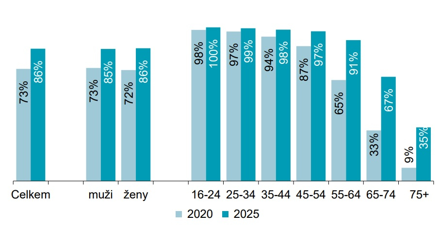 V Česku roste jak využívání chytrých telefonů, tak samotného internetu. V populaci starší 16 let používá chytrý telefon 88,5 % populace. Ve skupině 16-34 let je to téměř sto procent populace. Chytrý telefon používá i 68 % Čechů ve věku 65-74 let a 35 % populace starší 75 let. Vyplývá to ze statistiky ČSÚ za rok 2025. Ta zároveň ukazuje, že za pět let se rozšíření chytrých mobilních telefonů zvýšilo o 13 procentních bodů. Nejvýrazněji vzrostlo ve skupině 65-74 let, kde se za tuto dobu zdvojnásobilo.