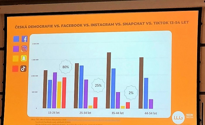Generace Z (mladí narození mezi roky 1995-2015) je silným uživatelem všech typů sociálních sítí, ve srovnání se staršími věkovými skupinami je ale velmi silně zastoupená na Instagramu, Snapchatu a TikToku, popsal Vojtěch Lambert z LCG Media. Průměrná míra engagementu influencerů v loňském roce byla ale na TikToku výrazně vyšší než u Instagramu a Snpachatu. Například v kategorii mikro influencerů dosahuje až 18 %, což je asi pětinásobek toho, co na Instagramu. V kategorii mega influencerů je zhruba čtyřnásobně vyšší, ukázal Vojtěch Lambert. Na TikToku je v Česku podle odhadu asi 1,3 mil. uživatelů, průměrný čas, který na síti tráví, je až dvojnásobně vyšší než čas, který generace Z tráví na ostatních sociálních sítích. Reklama na TikToku je podle Lamberta levná a zásah lze pořídit za jednotky tisíc korun.