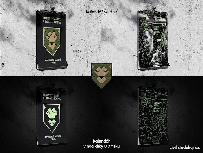 Kalendář, jehož křest proběhl 13. října v restauraci Červený Jelen, spojuje válečné hrdiny minulosti s vizuálně působivým uměním a osobnostmi současnosti. Každý měsíc přináší autentický příběh hrdinů, od odbojářky Inky Bernáškové, letce RAF Karla Janouška až po české vojáky padlé v Afghánistánu v roce 2014. Historické i novodobé fotografie doplňuje fluorescenční ilustrace a unikátní Preissigovo písmo, takže kalendář doslova „září ve tmě“.