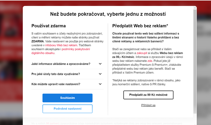 Díky cookies či dalším síťovým identifikátorům má provozovatel přehled o tom, jaké webové stránky a jaký obsah uživatel sleduje. Potřebuje k tomu ale souhlas od uživatele. Sbírá je pomocí tzv. cookies lišty. Díky získaným datům pak může například nabízet obsah, který odpovídá chování uživatelů či zobrazovat reklamu na základě jejich preferencí. Uživatelé, kteří tyto informace sdílet s CNC nechtějí, mohli dosud webové stránky CNC navštěvovat. Nově se ale CNC rozhodla těmto uživatelům přístup zpoplatnit, a to nabídkou „bez reklamy". Týká se to všech uživatelů, kteří chtějí weby CNC sledovat a souhlas CNC neudělili.