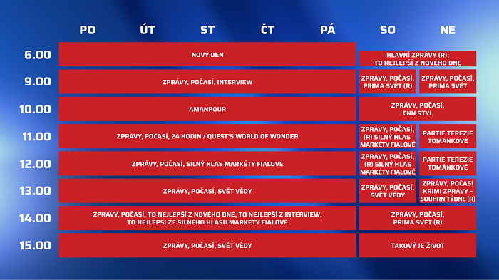 Zprávy v průběhu dne z Česka i celého světa bude CNN Prima News vysílat sedm dní v týdnu. Provázet jimi budou Josef Kluge, Kristýna Dušák, Lucie Hrdličková a Veronika Kubíčková.