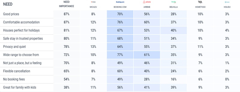 Evropská Belvilla se proto rozhodla komunikovat, že je „skvělá pro rodinu s dětmi“. Potřeba je sice důležitá „jen“ pro 38 % respondentů, ale většina velkých hráčů v ní není silná. Belvilla se proto tuto potřebu rozhodla obsadit a intenzivněji komunikovat. Z dat je pak vidět, že si lidé tuto asociaci ke značce vybavují relativně častěji (o 8 procentních bodů více).