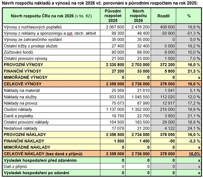 Rada Českého rozhlasu schválila návrh rozpočtu ČRo na rok 2026, který je sestaven jako vyrovnaný se shodným objemem nákladů a výnosů ve výši 2,736 mld. Kč. Oproti původnímu rozpočtu na rok 2025 se jedná o navýšení o 378 mil. Kč.