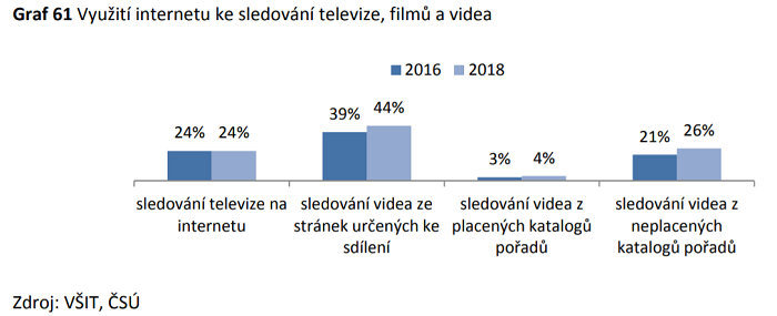 V roce 2018 si přes internet přehrálo neplacená videa 26 % obyvatel, o dva roky dříve to bylo 21 %. Necelá čtvrtina obyvatel sleduje televizi přes internet a tento podíl zůstává v posledních letech na stejné úrovni. Internetová videa, která uživatelé sami nahrávají a sdílí s ostatními, vloni vidělo 44 % populace a videa z placených platforem (např. Netflix) pak 4 % obyvatel. Vyplývá to ze zprávy Českého statistického úřadu (ČSÚ): Kulturní průmysly v ČR: Audiovizuální a mediální sektor – 2018.