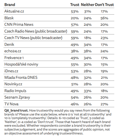 Za zpravodajství s nejvyšší důvěrou označili respondenti výzkumu z dotazovaných médií rovnocenně zpravodajství Českého rozhlasu (důvěřuje 59 %) a České televize (důvěřuje 59 %). Následuje CNN Prima News (57 %), Hospodářské noviny (55 %) a Seznam Zprávy (54 %). Do průzkumu ale nejsou zařazena všechna zpravodajská média, nejde tak o kompletní seznam médií podle jejich důvěryhodnosti. Ze zmíněné pětice si v meziročním srovnání polepšila jen CNN Prima News (+1 pb.), Česká televize zůstala na stejném skóre jako loni. Ostatní zmíněná média o několik procentních bodů poklesla.