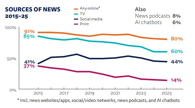 Ve většině světových zemí se tradiční zpravodajská média podle letošní studie obtížně spojují s velkou částí veřejnosti: klesá zapojení, důvěra i počet digitálních předplatných. Zrychlující se přechod ke konzumaci zpravodajství přes sociální sítě a video platformy dále oslabuje vliv „institucionální žurnalistiky“ a posiluje roztříštěné alternativní mediální prostředí v podobě podcasterů, youtuberů a tvůrců na TikToku. Tyto trendy jsou nejvýraznější ve Spojených státech, ale také v částech Asie, Latinské Ameriky a východní Evropy.