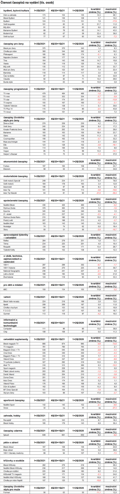 Souhrnná čtenost časopisů představovala v letošním prvním pololetí 6,77 mil. čtenářů, což je 76 % populace ve věku 12-79 let. Je to o 55 tisíc čtenářů víc, než kolik výzkum čtenosti Media projekt naměřil časopisům v období posledního čtvrtletí loňského roku a prvního čtvrtletí roku letošního (čtenost v delším období). Právě příchod jarních a letních měsíců, který se nesl ve znamení uvolňování protiepidemických opatření a nástupu období dovolených, přisuzují výzkumníci oživení čtenosti. Ve srovnání se stejným obdobím loňského roku byla celková čtenost časopisů srovnatelná (6,8 mil. čtenářů).