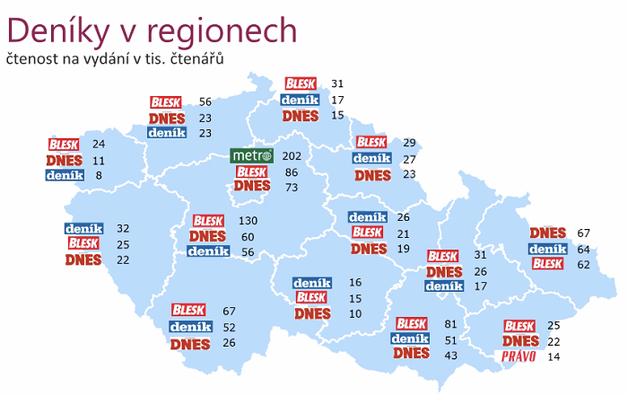 Regionální Deník dosahuje souhrnné čtenosti 425 tisíc čtenářů na vydání. Je to o osm tisíc čtenářů více než před rokem. Zvýšila se také čtenost bezplatných deníků Metro a E15, které narostly v meziročním i mezikvartálním srovnání.