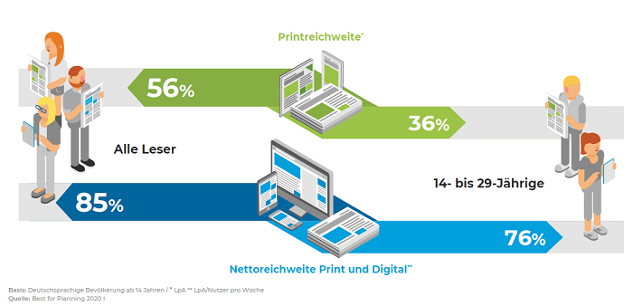 Celkový týdenní zásah novin (papírové i elektronické vydání) představuje v Německu 84,6 % populace (tj. téměř 60 mil. čtenářů), noviny oslovují všechny věkové skupiny – včetně tří čtvrtin (76 %) mladších 30 let. Papírová vydání pak čte 56 % německé populace, v mladší skupině do 30 let to je 36 %.