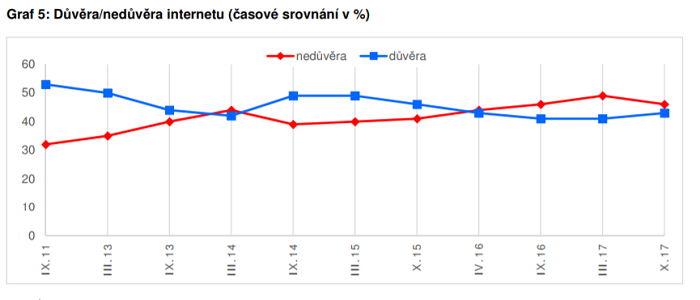 V případě internetu, který je do výzkumu zahrnován pravidelně od roku 2013, když předtím byl již jednou zařazen do výzkumu v září 2011, je vidět podobný trend jako v případě klasických médií. Od prvního výzkumu ze září 2011 důvěra až do jara roku 2014 měla sestupnou tendenci. Pak se trend na rok obrátil, avšak již od října minulého roku začal opět pokles důvěry. V září 2016 a v březnu 2017 došlo k tomu, že nedůvěra převážila nad důvěrou (o 5, resp. o 8 procentních bodů). V letošním roce se tento rozdíl snížil na statisticky nevýznamné tři procentní body. Důvěra k internetu je výrazně podmíněna věkem.