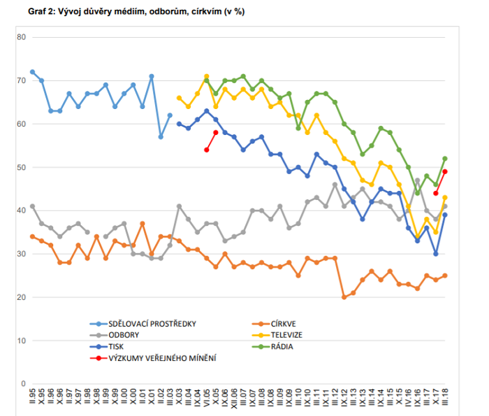 V případě médií (televize, tisk, rádio) byl přibližně od roku 2011 zaznamenán poměrně výrazný postupný pokles důvěry, který se v březnu 2014 zastavil (během roku došlo k nárůstu důvěry zhruba o 5 procentních bodů), avšak tento stav neměl dlouhého trvání a v březnu 2015 opět nastal pokles. V březnu minulého roku podíl důvěry mírně vzrostl, nicméně do dalšího šetření (říjen 2017) statisticky významně