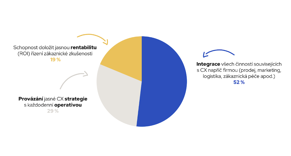S tím přímo souvisí třetí oblast našeho zkoumání: zajímaly nás výzvy, pokud jde o řízení zákaznické zkušenosti v praxi. Zákaznická zkušenost samozřejmě není tím, co si v zasedací místnosti definujeme, ani heslo, které si napíšeme na zeď – je to zážitek každého jednotlivého zákazníka. A to od okamžiku, kdy o vaší značce slyší přes nákup až k poprodejním službám. A právě tady je kámen úrazu řízení CX – více než polovina respondentů uvedla, že jejich hlavní výzvou je integrace napříč zákaznickou cestou.